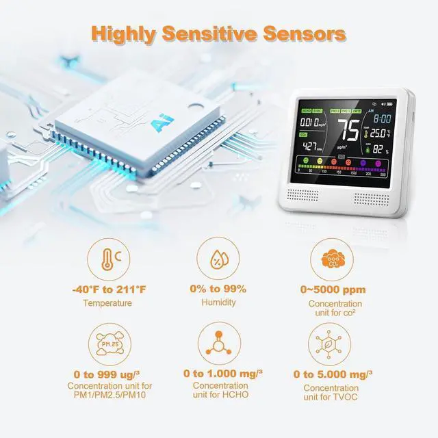 5. [Plug-and-Play Operation with Auto-Calibration] Ready to Use Out of the Box, No Complex Setup RequiredThe device automatically calibrates sensors upon startup without requiring user intervention or network connectivity. It performs periodic self-calibration to maintain measurement accuracy over time and allows one-touch switching between °C and °F. The intuitive interface makes it easy to deploy quickly in various living, working, and mobile environments, even for users without technical expertise.