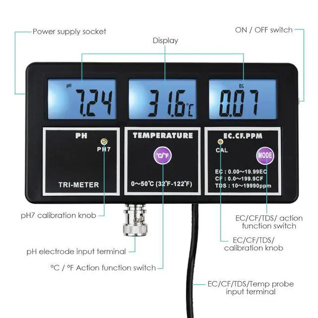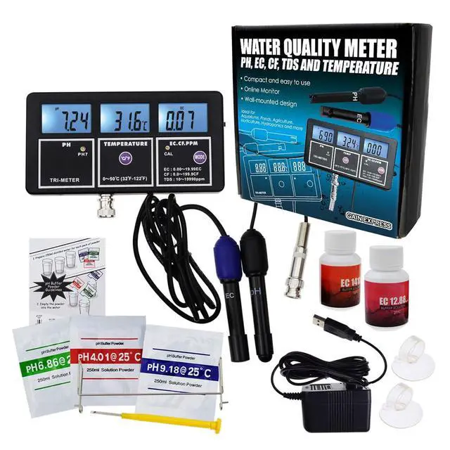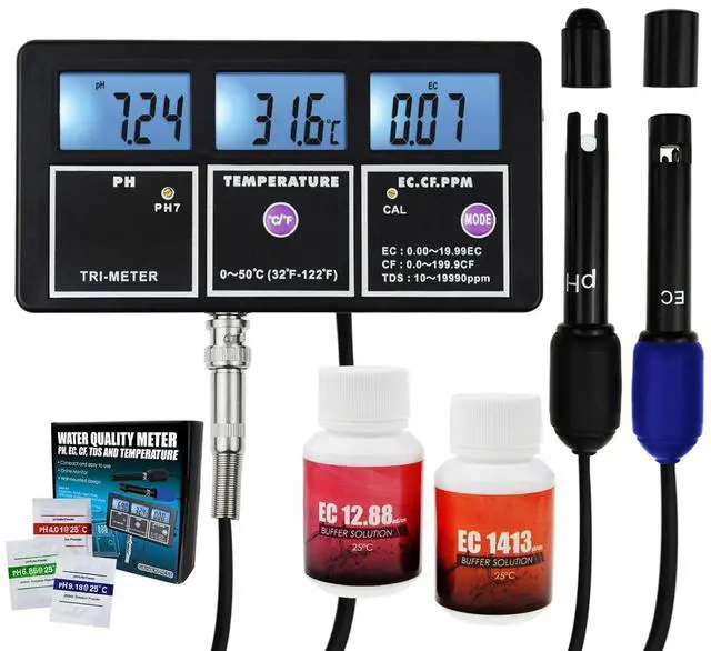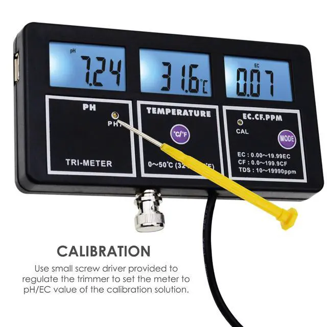 pH calibration powders and EC calibration solution are included in the set. Calibrates easily and offer safer and precise measurement Best in aquariums, hydroponics, laboratory, spas, swimming pools and other water systems