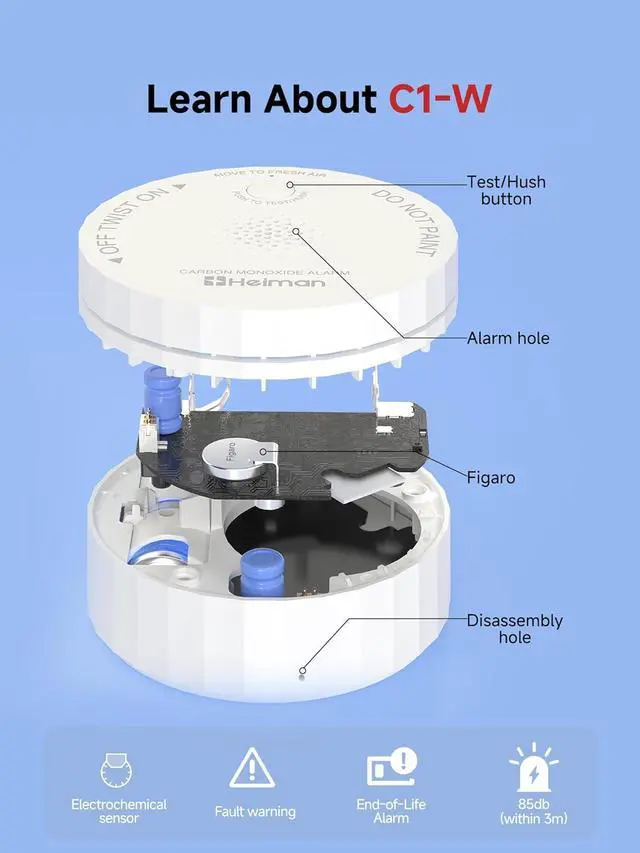 Japan-Made FIGARO TGS5141 Sensor Inside: Our CO detector uses the TGS5141 sensor from FIGARO Japan, a global leader in gas-sensing technology. Unlike low-cost semiconductor sensors that can be affected by humidity, rapid temperature changes, or nearby gas appliances and trigger unnecessary alarms, the 10-year TGS5141 features a proven electrochemical design with a solid-state electrolyte for long-term stability. It delivers a linear response from 05000 ppm, providing precise CO level tracking and reliable performance even during sudden temperature or humidity changes. This advanced technology reduces false alerts while keeping your family protected from dangerous carbon monoxide levels.