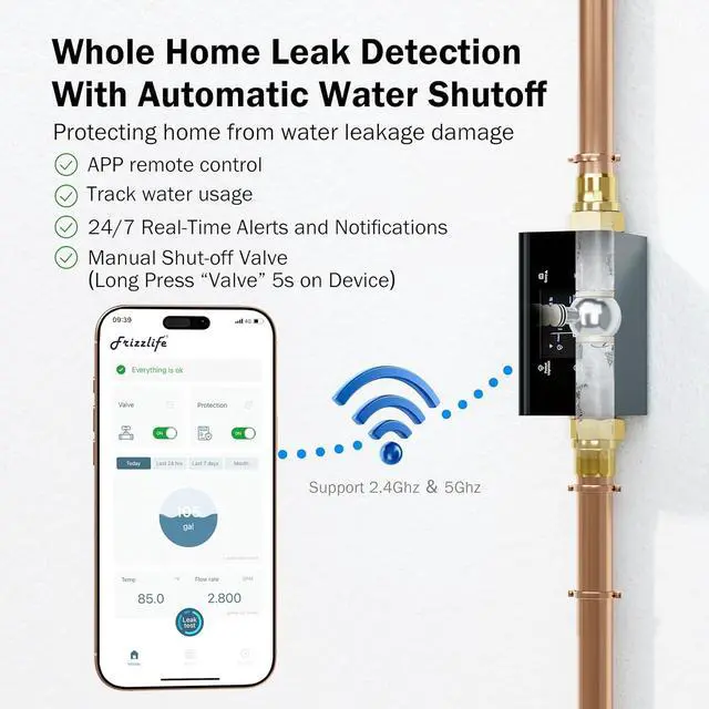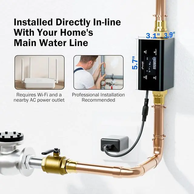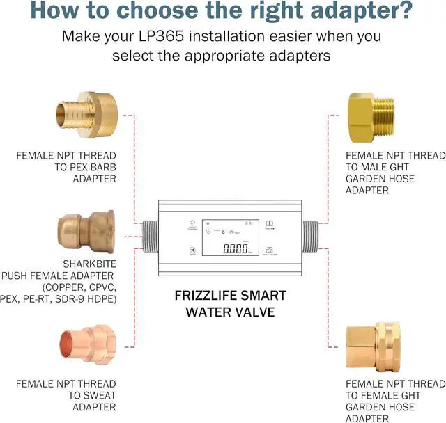 [Fits 1-Inch 3/4-Inch Diameter Pipe]--The leak protector fits both 1-inch and 3/4-inch pipes, with all necessary installation components included. for best results, professional installation is recommended. also provides 24/7 customer support for any questions, ensuring youre covered from purchase to setup and beyond. LP365 includesLP365 System with NPT=1 (MALE) pipeNPT=3/4 (MALE) adapters*2plug*1, 6.6 feet power cable*1, Plumbing Tape *1.