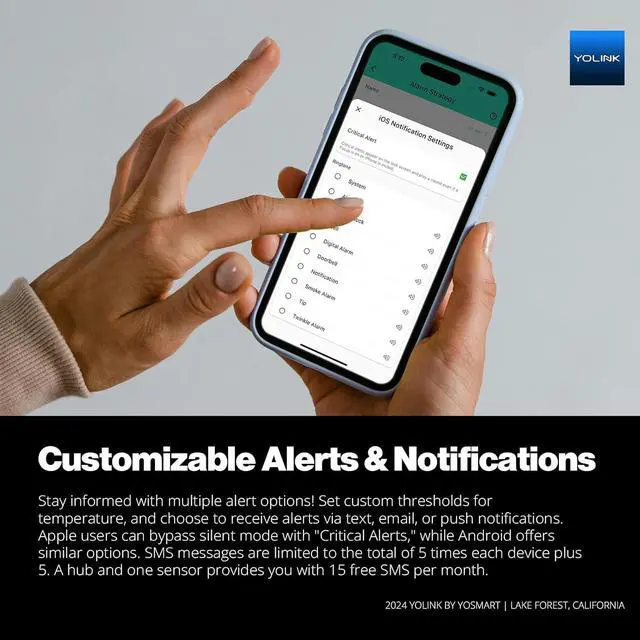 Customizable Alerts & Notifications: Stay informed with multiple alert options! Set custom thresholds for temperature, and choose to receive alerts via text, email, or push notifications. users can bypass silent mode with "Critical Alerts, " while Android offers similar options. SMS messages are limited to the total of 5 times each device plus 5. A hub and one sensor provides you with 15 free SMS per month.