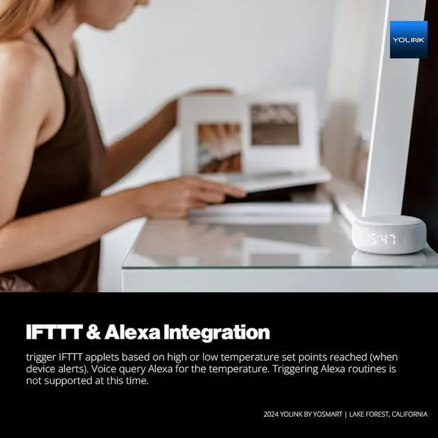 IFTTT & Alexa Integration: trigger IFTTT ts based on high or low temperature set points reached (when device alerts). Voice query Alexa for the temperature. Triggering Alexa routines is not supported at this time.