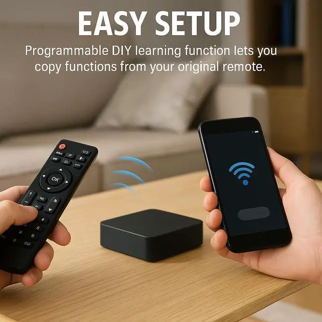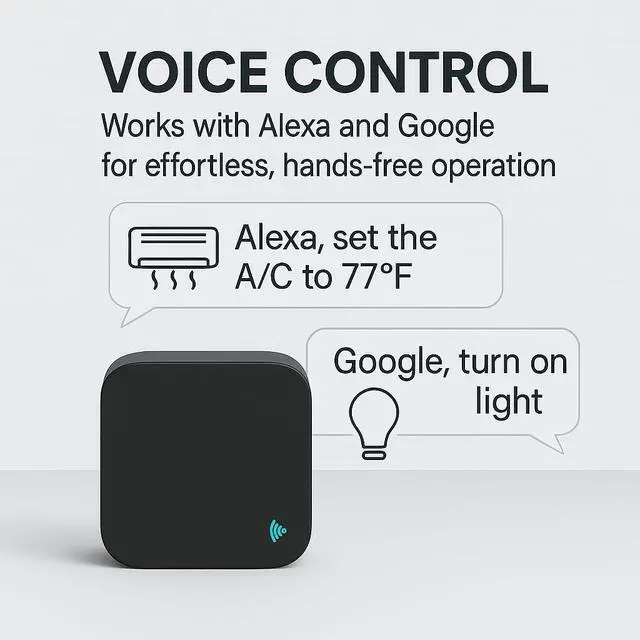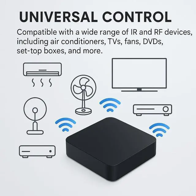Before You BuyCompatibility Checklist: IR requires line-of-sight within ~810 m; supports IR devices and 433 MHz fixed-code RF only; not Bluetooth/Zigbee/Z-Wave/315/868 MHz/HomeKit.