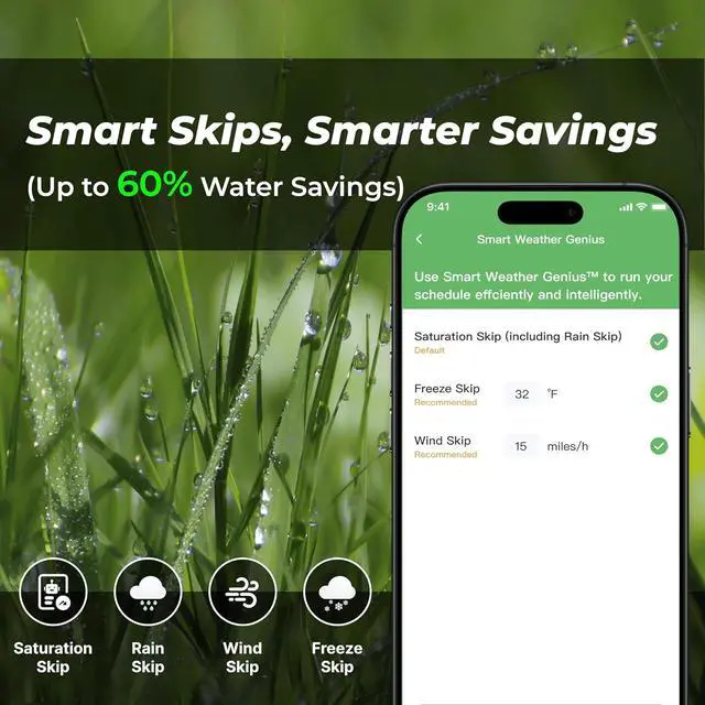 Smart Skipping & Seasonal Adjustment: The smart weather skip function automatically pauses irrigation during rain, strong winds, or freezing conditions, while the saturation skip prevents watering when soil moisture is sufficient. Seasonal adjustment optimizes watering schedules based on seasonal changes, ensuring your lawn receives just the right amount of water while reducing waste