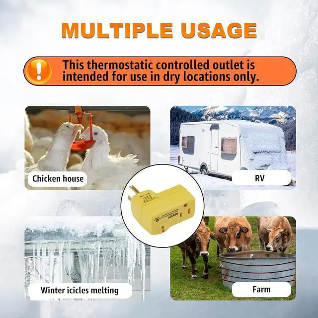 [Versatile Applications] With a maximum capacity of 15A, this thermostat outlet is ideal for 120V AC electric heaters, gas heaters, engine block heaters, pipe heating cables, roof de-icing cables, and more. Designed for dry locations only.