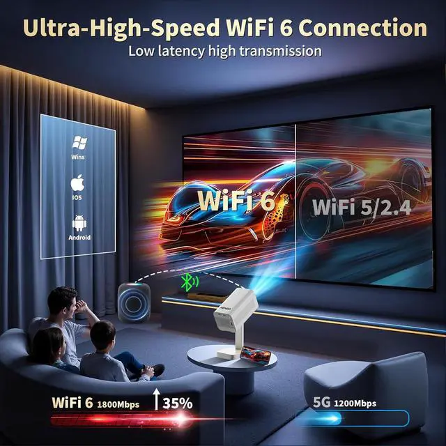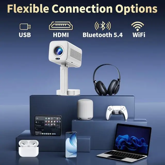 Latest WiFi 6 Technology and Bluetooth 5.4T he projector features the latest dual-band WiFi 6 technology for 2026, compatible with both 5GHz and 2.4GH z bands. It delivers high-speed network connectivity, robust interference resistance, and a stable, seamless wireless projection experience. The latest Bluetooth 5.4 technology enables connection to headphones, speakers and other devices, while also allowing the projector to function as a dedicated sound system. This creates a personalised audio environment for enjoying music and films anytime, anywhere.