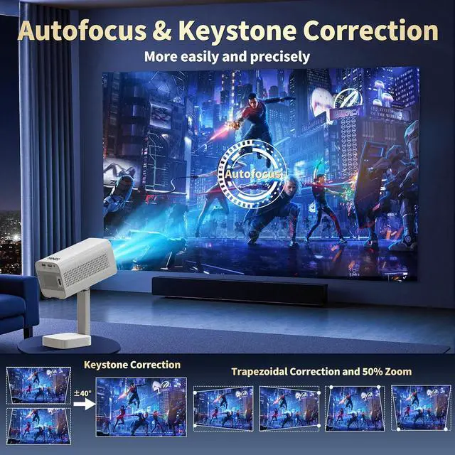 Autofocus & Automatic Keystone Correction video projector supports automatic vertical keystone correction of ±20°, swiftly adjusting the image to a standard rectangle regardless of the projector's position, eliminating the need for manual adjustment. The autofocus function achieves sharp focus within 3 seconds of power-up and automatically refocuses after moving the projector, 50%-100%