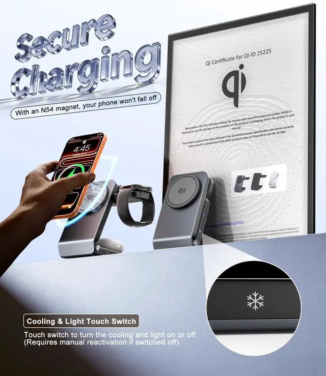 N54 Strong Magnet, Precise Alignment's 25W magnetic charging station Built-in N54 strong magnets, fully compatible with MagSafe chargers. The strong magnetic force allows for easy one-second precise alignment between the device and the charging area, ensuring charging efficiency and stability.