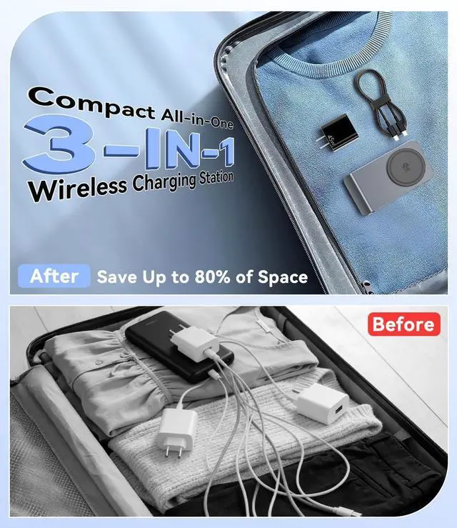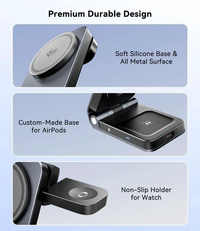 Foldable Design, Portable and Multi-Angle Adjustable's 25W magnetic charging station stand is foldable for easy portability, and can still charge iPhones when folded. Weighing only approximately 254.6 grams, the charging stand is adjustable up to 60°, accommodating various usage postures including portrait and landscape.