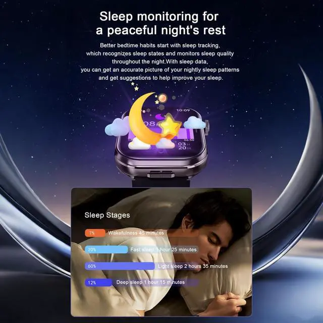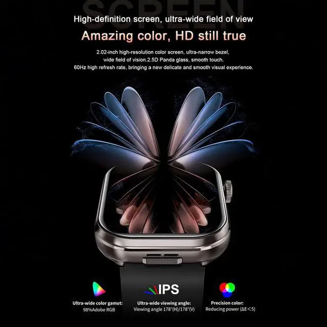 Comprehensive Practical FeaturesThis smartwatch comes with wide range of functions, including step counting, dynamic heart rate monitoring, sleep tracking, alarm clock, calculator, breathing exercises, calorie calculation, games, sedentary reminder, stopwatch, wrist flip to light up the screen, music control, weather forecast, multi-watch face switching, water drinking reminder, and over 100 sports modes. It can not only meet your needs for checking the time and receiving messages.