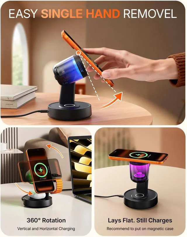 CHARGING: Break free from stands limited to just vertical or horizontal positions. Featuring a precision 90° adjustable design, this magnetic charger seamlessly switches between vertical, horizontal, andexclusivelycompletely flat charging modes. While traditional stands risk overnight slips and interrupted charging by keeping the phone propped up, our unique flat mode ensures ultimate stability and a clean bedside aesthetic, preventing accidental falls. Combined with 360° rotation for optimal viewing modes, enjoy
