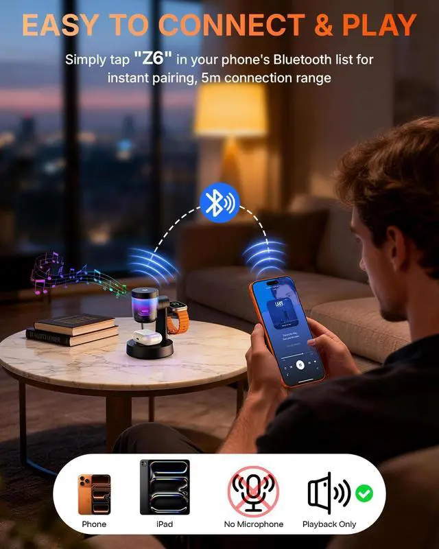 SLEEP FRIENDLY: Upon powering on, the charger automatically activates Bluetooth and the breathing ambient light. simply long-press the button for 2 seconds to completely disable both Bluetooth and lighting functionsensuring absolute silence and darkness with zero audio or visual disturbance. Alternatively, short-press to cycle through color options until the light is fully turned off while keeping Bluetooth active for seamless morning connectivity. Whether you prefer total sensory shutdown or quiet wireless standby, this thoughtful dual-mode design guarantees peaceful, interruption-free rest throughout the night