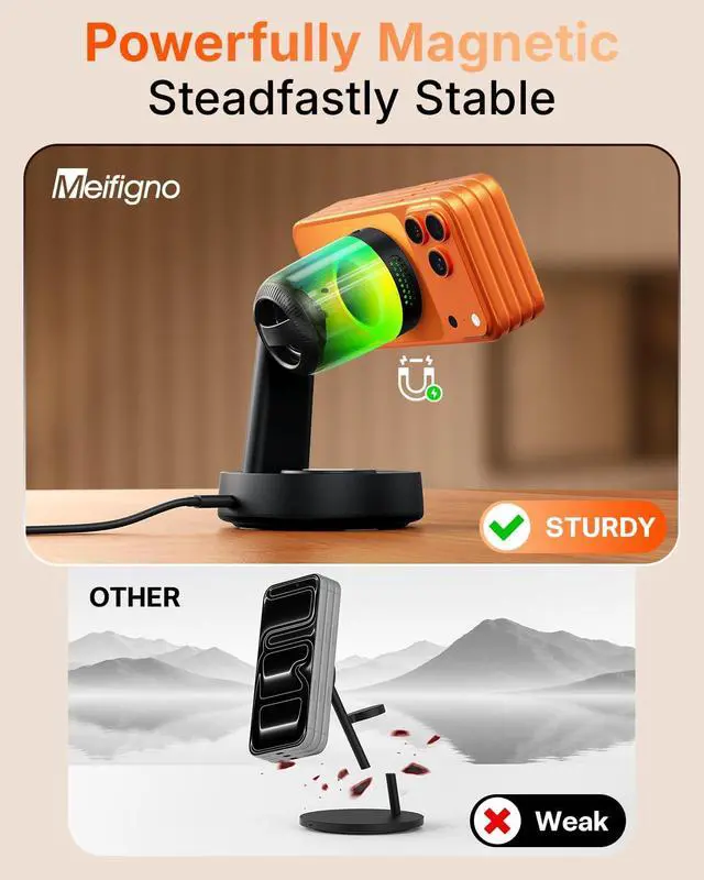 FIRM SUPPORT: This compatible magsafe charger stand for built with powerful N52 magnets for instant, precise coil alignment. Simply place your MagSafe-compatible iPhone or magnetic case-equipped device, and it locks securely into place. The low center of gravity design and non-slip base provide exceptional stabilityeasily remove your phone with one hand without tipping the stand. For a clearer and easier one-handed removal method, please see the video