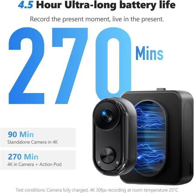 Long battery life: The tiny sport camera can record up to 90 minutes of 4K 30fps video continuously; the built-in 1300mAh battery in the action pod extends recording time to 270 minutes. The magnetic action pod serves as both storage and charging, capable of charging the camera twice. Recording while charging, effectively extending action camera recording time. This helmet camera is ideal for long hikes, skiing, cycling, or various other outdoor activities