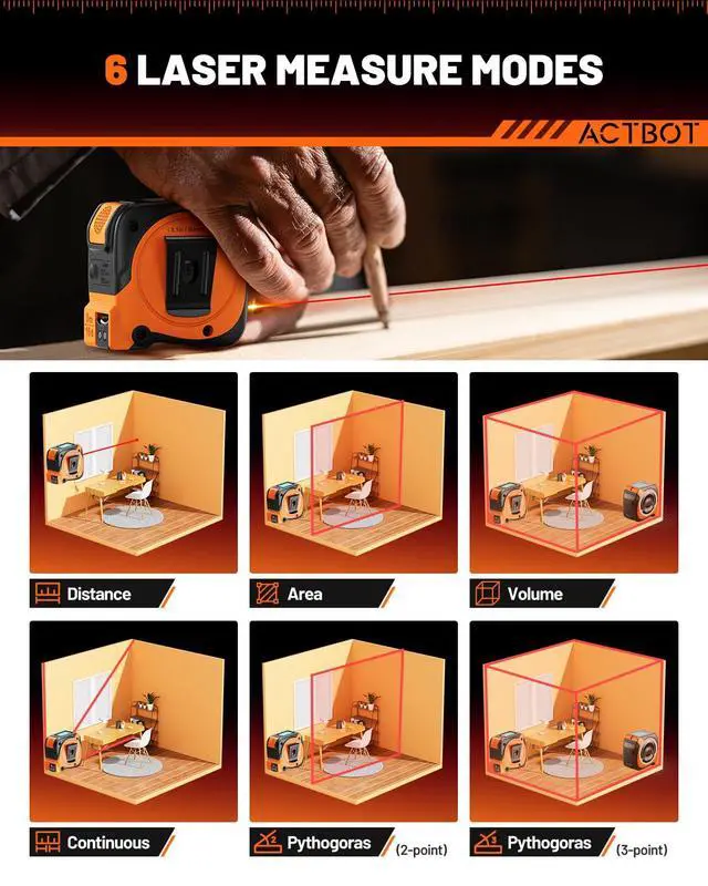 Professional measurement modes: This digital laser tape measure offers multiple measurement units, including ft/ft+in/in/m and utilize the six measurement modes: distance, continuous, area, volume, Pythagorean-two points and Pythagorean-three points. Essential for architects, woodworkers, and DIY tile fitting