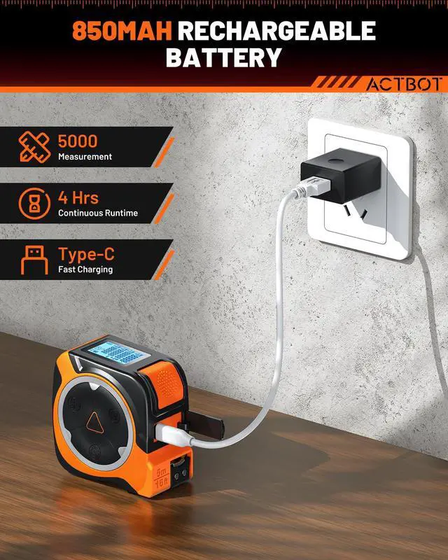 850mAh USB-C Rechargeable Battery: No power anxiety! This tape measure with laser features Type-C charging, so you can juice it up anytime with a power bank or car charger. Fully charged, it handles up to 5, 000 laser measurements and auto-shuts off after 150 seconds of idle time. Eco-friendly for construction sites and home projects.