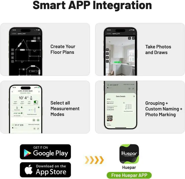 Multiple Measurement Modes & Unit SwitchSupports distance, angle, area, volume, and 4 Pythagorean modes. Features continuous measurement, addition & subtraction, automatic area/volume calculation, and stores up to 30 groups of data. Switchable units (m/ft/in/ft+in) meet diverse measurement needs