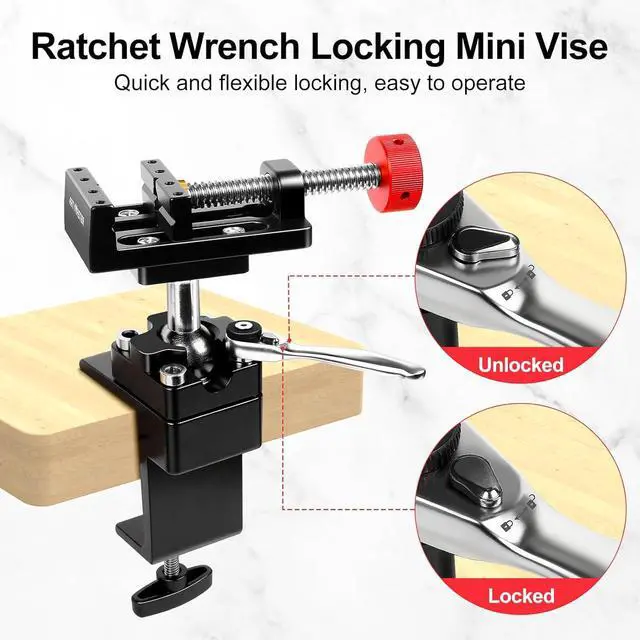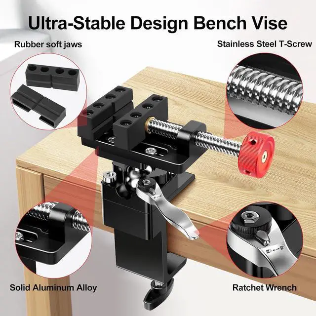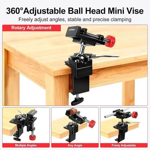 The Ideal Work Companion Mini ViseThis mini vise is made from high-strength aluminum alloy with a 02.48 inch clamping range. Its ratchet wrench and 360-degree rotating ball head offer flexible, effortless, and quick angle adjustments for stable, precise gripping. Ideal for small projects and precision tasks.