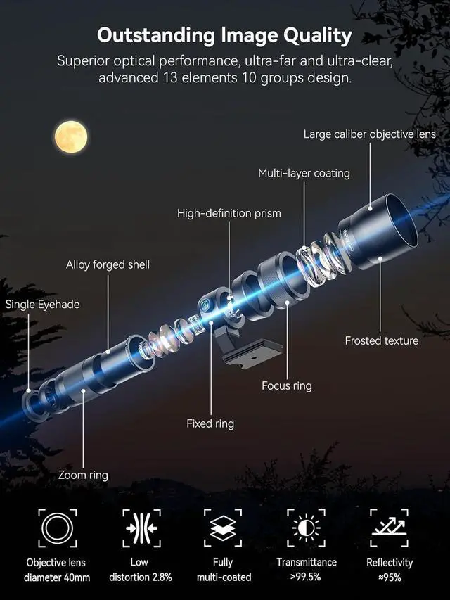 Expandable 58mm filter: Featuring a premium 45mm large-diameter objective lens, this optic delivers excellent light gathering and a wide field of viewcapturing clear, bright images in low-light environments at dawn or dusk. Its standard 58mm filter thread also accommodates professional UV, VND, CPL, star, and specialty filters, unlocking creative possibilities while enhancing your visual experience