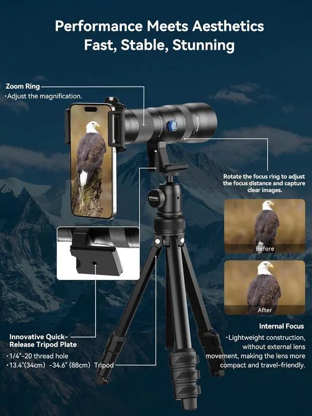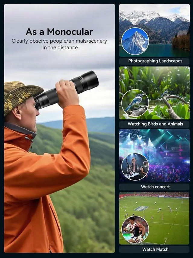 Aircraft grade aluminum: Crafted from aviation-grade aluminum, this telephoto lens body offers exceptional durability. The kit also includes a matching tripod constructed from the same robust material. Featuring 4-section legs (extending 34-88cm) with triple anti-slip locks (3kg capacity), a smooth 360° pan-tilt head, and a universal 1/4"-20 thread mount (48cm base spread), the tripod ensures solid stability. Essential for bird-watching, wildlife observation, hiking, camping, stargazing, and more, this kit blends portability, durability, and professional control.
