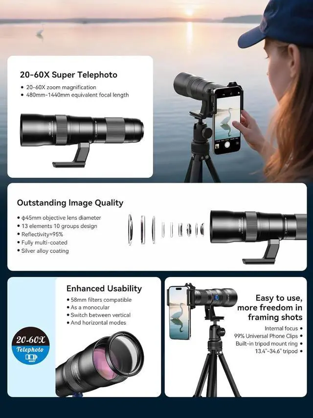 2 ways to use: Experience versatile viewing with our telephoto lens featuring two instant-use modes. Clip it directly to your smartphone's main camera for powerful 20-60X zoom photography and videography of distant wildlife, concerts, or lunar surfaces; or attach the eyecup to convert it into a standalone monocular telescope for real-time optical observation of landscapes and fast-moving subjectsno electronic device required