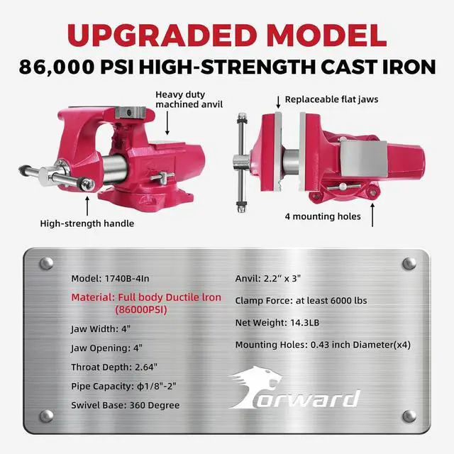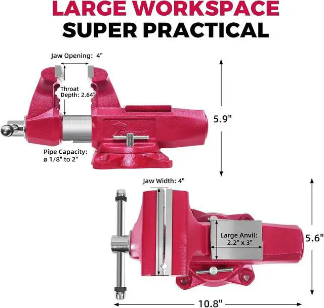 Powerful Clamping Force Jaws: Equipped with 2 sets of replaceable serrated jaws plates & pipe jaws with a hardness of 45 - 56HRC, it offers a robust clamping force of 6, 000 lbs (27 kN), firmly securing your workpieces in the vice