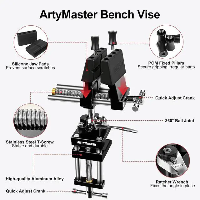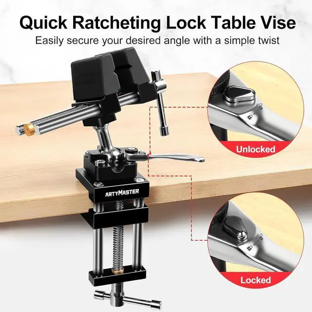 360° RotatingBench Vise Upgrade Your Workspace with the Vise The 4-inch bench vise features an innovative 360° ball-head rotation and quick ratchet lock. Whether youre a woodworker refining joints, a hobbyist repairing tools, or tackling household projects, this vise adapts effortlessly to your every need.