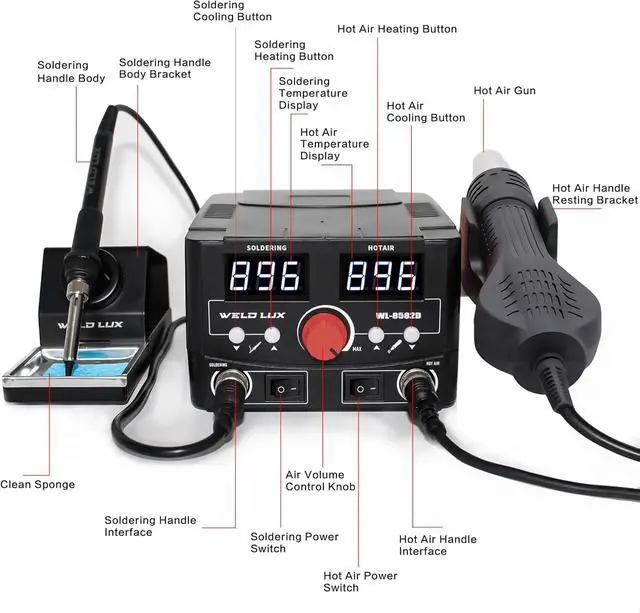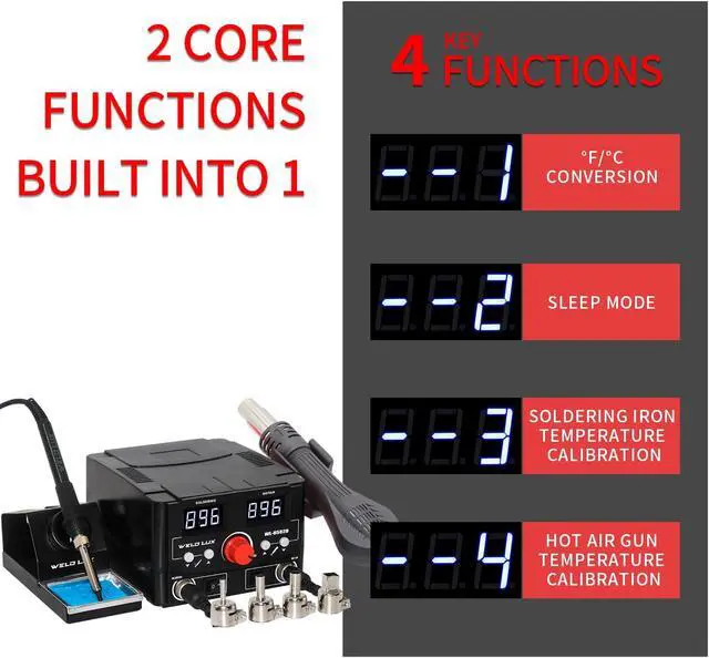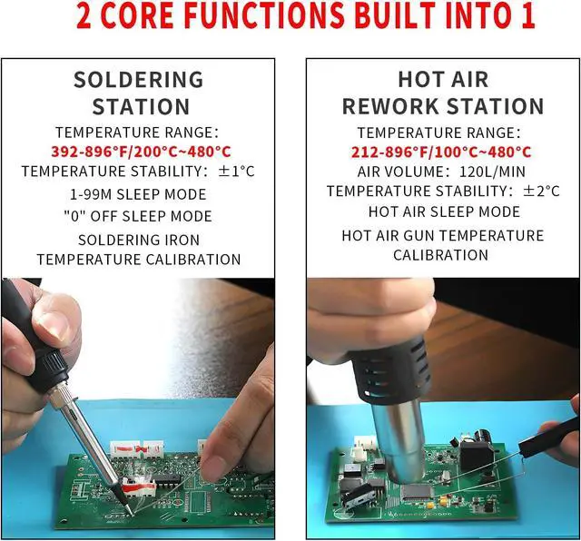 Complete Accessory Package: Includes soldering station with heat gun, 10 tips, 3 ESD tweezers, IC extractor, desoldering pump, lead-free solder (35g), and heat-resistant mat ( 11.8" x 7.9" )