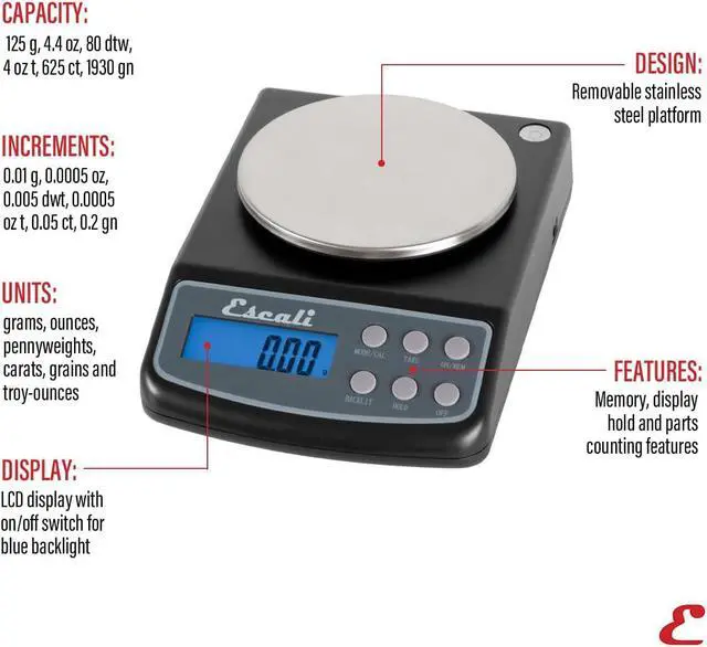 Product FeaturesCapacity 125 gram / Resolution 0.01 gramRound Stainless Steel removable weighing platform for easy clean-upSix units of measure: Grams, Ounces, Grains, Carats, Pennyweights and Troy-ouncesParts Counting FeatureHold feature, shows the weight after you remove the item from the platform The L-series digital scales are highly accurate easy to use digital scales with some of the industry's best features.