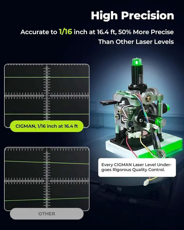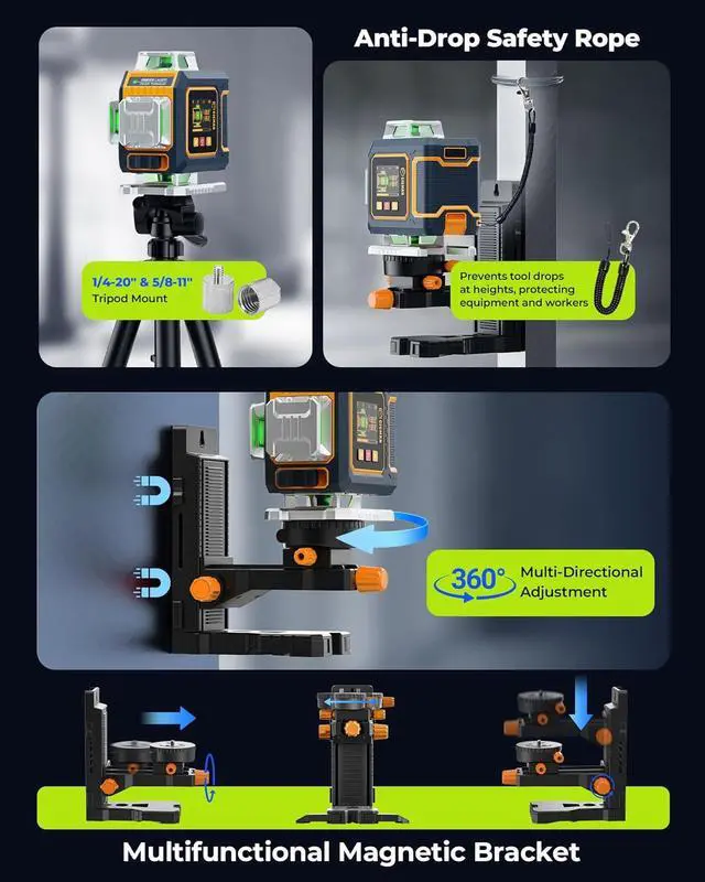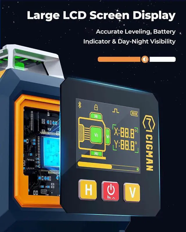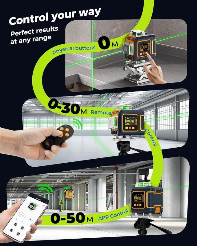 Side LCD & App Control: Large side LCD shows modes, leveling status and battery in real time; liftable stand raises the beam to working height. Adjust lines, brightness and settings via Bluetooth app (Smart Leveling, iOS/Android) or remote for hands-free, faster layouts.