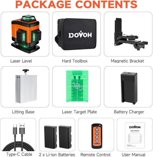 Magnetic Bracket & Dual Batteries construction laser level include a multifunctional magnetic bracket, it can attach to a metal surface, clip on a board, or hanging on a nail. K4-360G laser level includes dual 7.4V 2600mAh lithium rechargeable batteries, which provide longer working time.