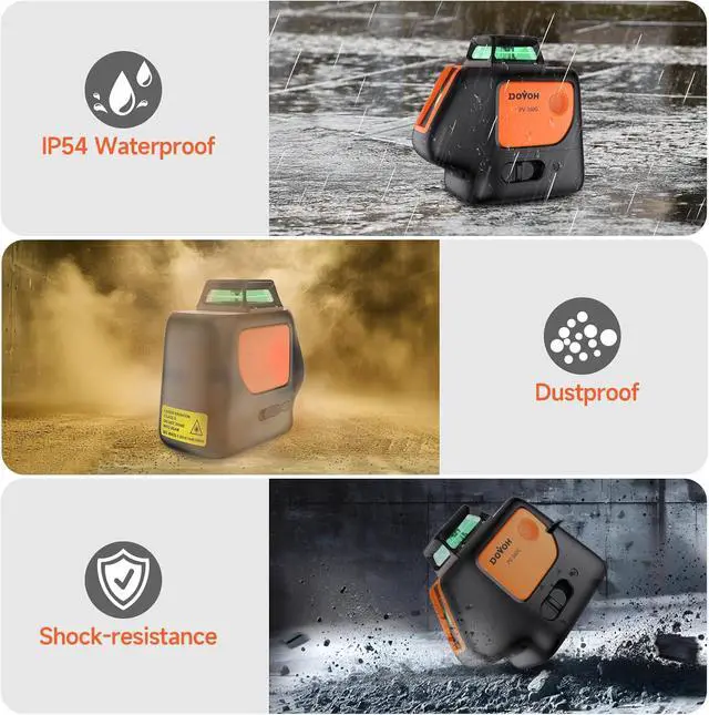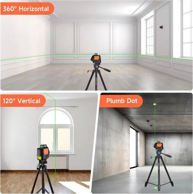 All-in-one AlignmentThe self leveling laser level projects a full-room 360° horizontal line alongside a 120° vertical line and dual plumb dots (up/down), delivering full spatial coverage for level floors, walls, and ceilings.