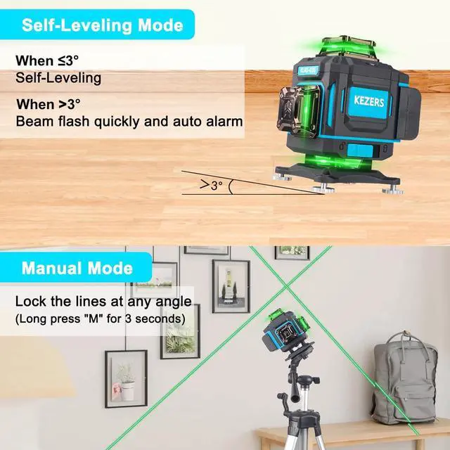 Self / Manual Leveling &Pulse Mode 4D laser level line tool with smart pendulum system, the laser tool self levels and indicates out-of -level condition while pendulum unlocked. The Line level will beep when out of self-leveling range±3°. Once pendulum locked, it switches to manual mode to lock lines for use at any angle. It also can be used in bright environment or long distance up to 164ft in pulse mode with receiver from.