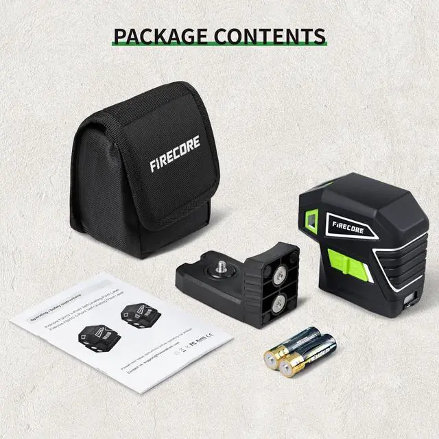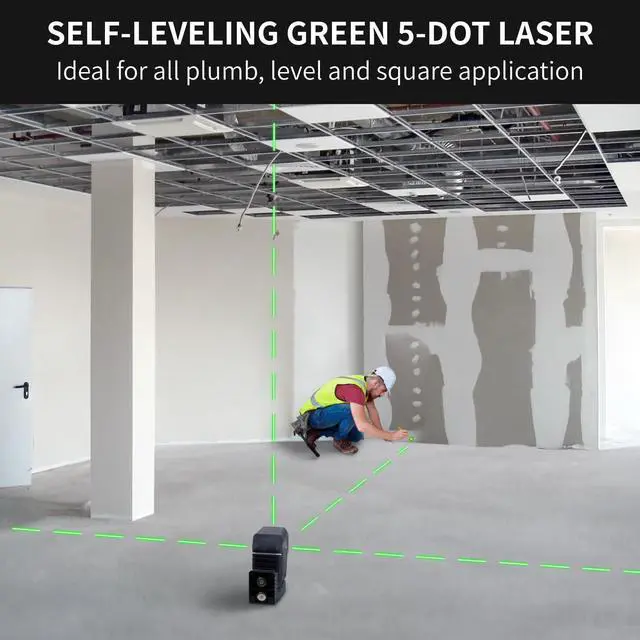 PRODUCT SPECIFICATIONS: F501G self-leveling 5 dot laser works on 2 "AA" alkaline batteries (included) and has a continuous battery life of 4 hours. It has IP54 dust/water resistant construction for convenient indoor and outdoor work