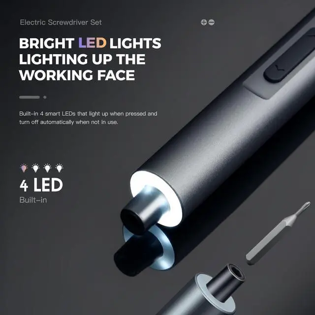 Thoughtful Designs: This ergonomic rechargeable electric screwdriver is compact and portable, making it perfect for efficient and precise screwwork. Its user-friendly switches allow for easy screws installation or removal, clockwise or counterclockwise. Additionally, the inclusion of four auto-on bright LED lights ensures optimal visibility, even in dimly lit spaces, making the mini screwdriver an ideal tool for repairing laptops and other precision devices.