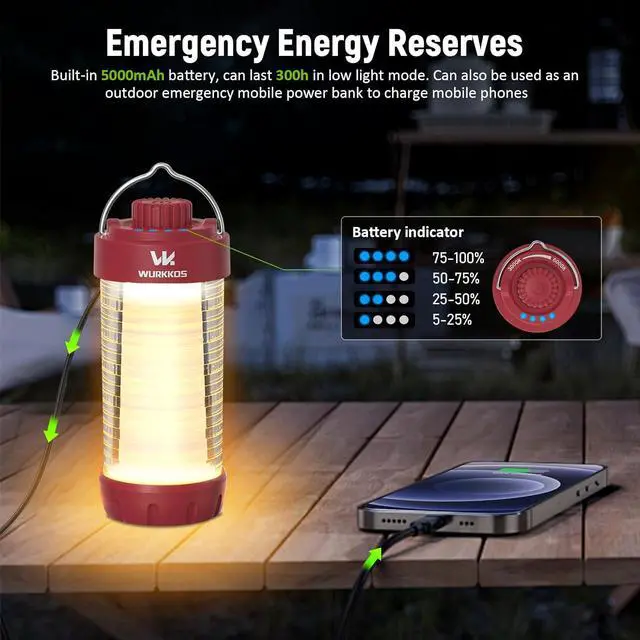 [Emergency Energy Reserve]: This rechargeable lantern provides up to 300 hours of operation in low brightness mode, while the battery can be removed and replaced to provide you with continuous lighting. It can also be used as a 5000mAh power bank to charge your mobile phone in emergencies, power outages and outdoors.