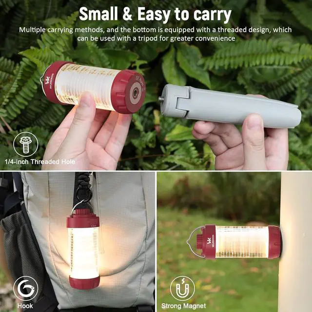 Carry: This waterproof tent lantern is compact and portable, offering multiple carrying options. It stands only 4.17" tall( 10.6 cm). The included lanyard makes it easy to hang it from a backpack or belt. The strong magnetic base allows you to keep your hands free. The 1/4-inch thread on the bottom allows you to attach it to a tripod, making it an ideal choice for outdoor camping, allowing you to carry it without any hassles.
