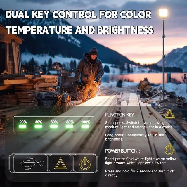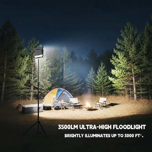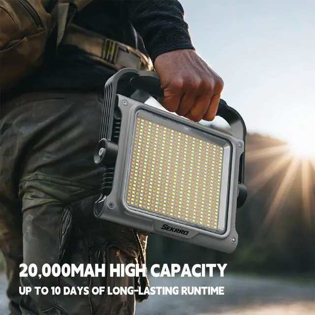 20000mAh Rechargeable Battery for Up to 10 Days of Use This rechargeable work light for camping and extended projects is equipped with a high-capacity 20000mAh battery. It offers exceptional runtimeup to 10 days on low 90-lumen mode for ambient lighting, or 4 hours at full 3500 lumens for heavy-duty tasks. Recharges in 7-8 hours, ideal for prolonged outdoor adventures, emergencies, or multi-day projects.