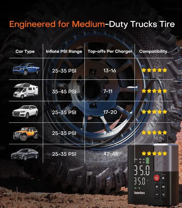 45W Super Fast ChargingAs a mobile power supply, equipped with 45W USB-C input and output port and 45W USB-A output port, which can quickly charge the other electronic devices; the power supply speed is 3 times faster than 99% of the air pumps on the market and 2 times faster than most mobile power supplies. car tire pump supports a maximum charging input of 45W and can be fully charged in 2 hours.