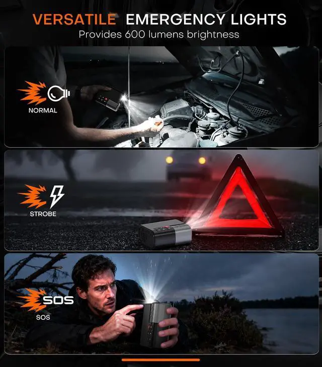 Safe and reliable designCar tire inflator shell uses fireproof materials and aluminum alloy heat dissipation modules, which are flame retardant and fall-resistant; the internal unique cooling design and heat dissipation system, high temperature (248°F) automatically stops the working program, providing all-round safety protection to prevent overcharging, short circuit, overheating, etc.