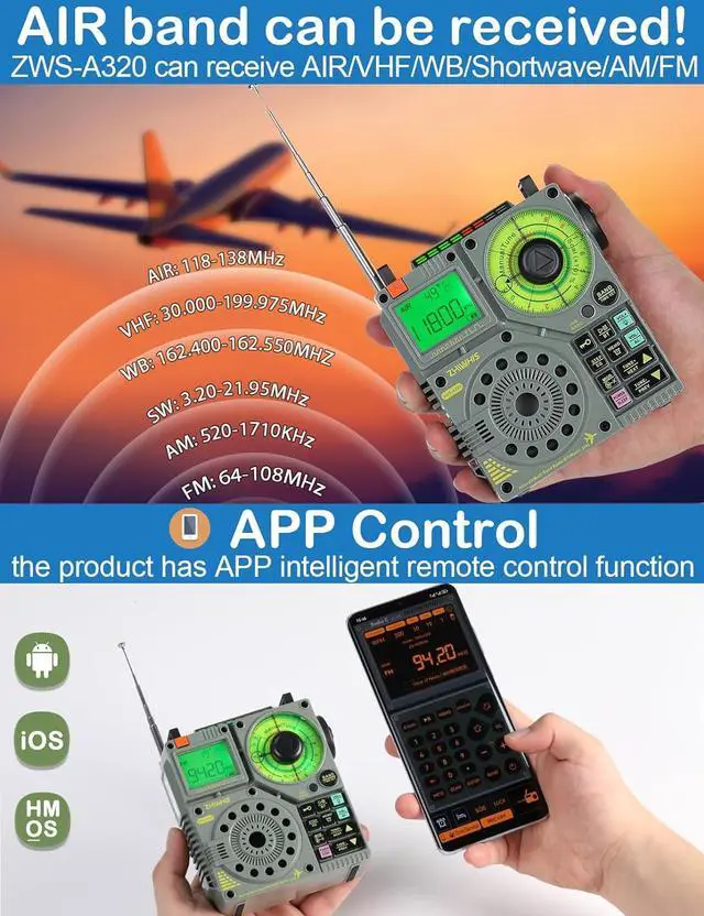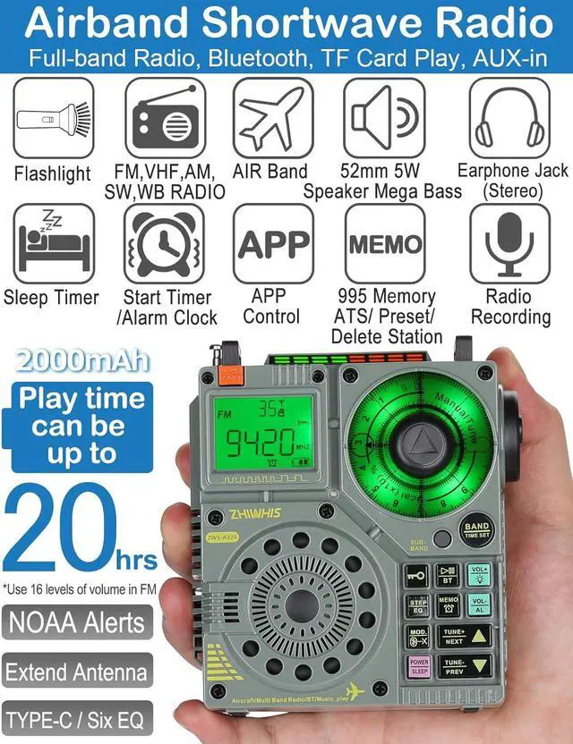 [Excellent Reception & 995 Memory] - You get AIR, FM, VHF, AM, SW ( 3.20 - 21.95MH z), and weather band with NOAA emergency alert function. If the built in 21.6 antenna isnt enough, there is an additional 9.85 foot long wire antenna that you can clip onto the built-in antenna for added reception capabilities. The built-in antenna is made of high toughness material, which is not easy to break. The radio can store 995 channels (FM/VHF/AM/SW/AIR: 199 of each) and can manually delete saved channels.