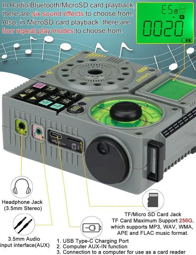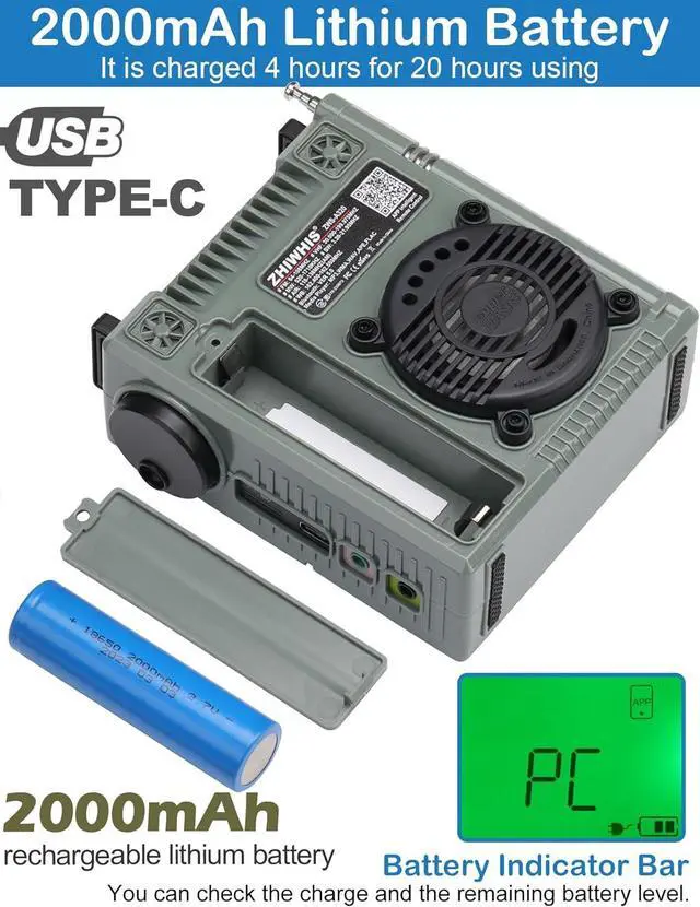 [Superb Sound & Replaceable Battery] - The 2-inch 5W high quality speaker is backed by a bass radiator and driven by a high quality amplifier. With the volume turned up it is quite loud and full with little to no distortion. It also has 6 equalization options, not only supports Bluetooth and MicroSD card playback mode, but also supports radio mode. In addition, It uses a replaceable 2000MAH lithium battery which is charged through a USB-C jack. It is charged 4 hours for 20 hours using.