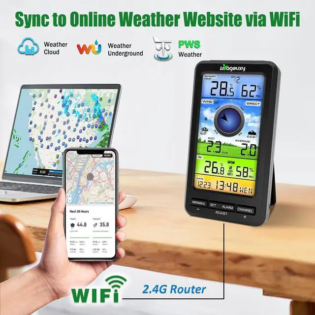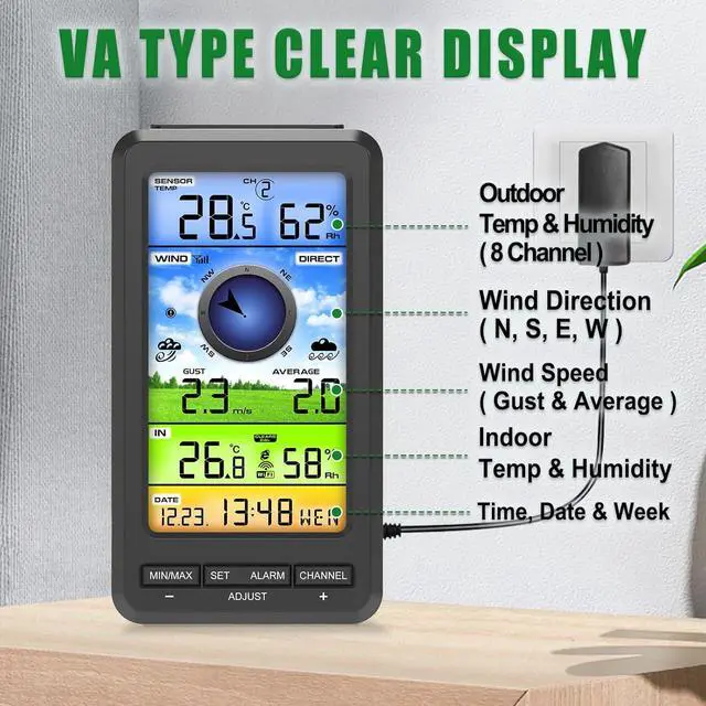 More Function and ApplicationOptional imperial/metric units of measurement. High low alarms, Min/Max records. Weather Data calibration. Wirelessly receive readings for indoor/outdoor temperature and humidity, wind speed/direction to your home weather station. WiFi weather stations can also serve as personal weather stations for homes, farms, baby/children's rooms, warehouses, gardens, offices, greenhouses, etc