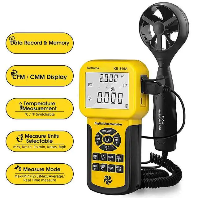 Pro CFM MeterJust input the cross-sectional area value into this wind measuring gauge, then it would display the wind flow in CFM (cubic feet per minute) when you monitor airspeed for HVAC installation, AC air conditioner system maintenance, household air vent balance and woodshop dust collection system.