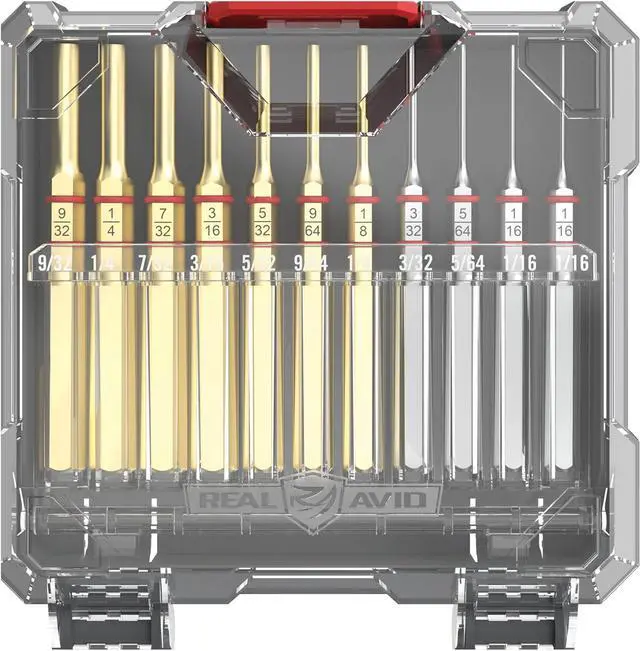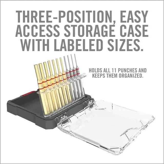 CASE: Our 11-piece punch set comes in a convenient case that is easy to access & all the punches are clearly labeled for your convenience. This compact case fits perfectly in any range bag.