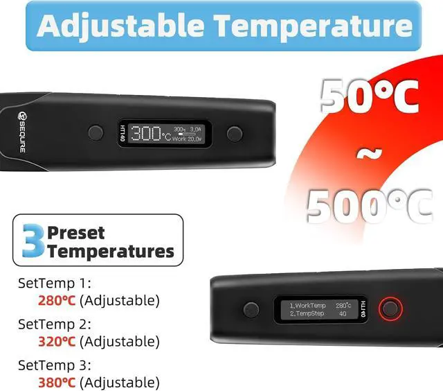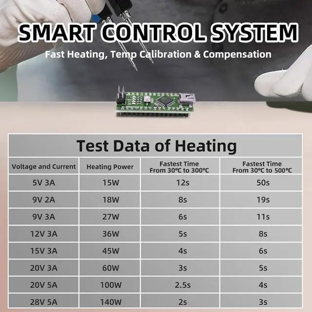 Dual Power Input HT140 portable soldering iron kit features Type-C & DC5525 power jack, supports PD 3.1 / 3.0 / 2.0, QC 3.0 / 2.0, DC (28V Max). The voltage range is extended to 5V-28V, with maximum power up to 140W. Accepting more power supplies like 3S-6S lipo battery, PD charger, power adapter, power bank etc.