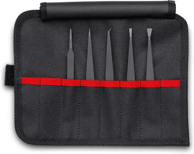 Plastic. Contains 5 plastic ESD tweezers in a tool roll. 7 compartment tool roll made of hard-wearing polyester fabric. Smooth gripping surface. Contains one of each of the following tweezers: 92 09 01 ESD, 92 09 02 ESD, 92 09 03 ESD, 92 09 04 ESD and 92 09 05 ESD. ESD plastic tweezers offer maximum surface protection when handling sensitive electronic components, micro-mechanical parts, as well as glass and ceramic components. Good chemical resistance to most oils, lubricants, fuels and nonpolar solvents. The plastic and carbon fiber tips are flexible, fatigue-resistant, vibration-dampening and water-repellent.