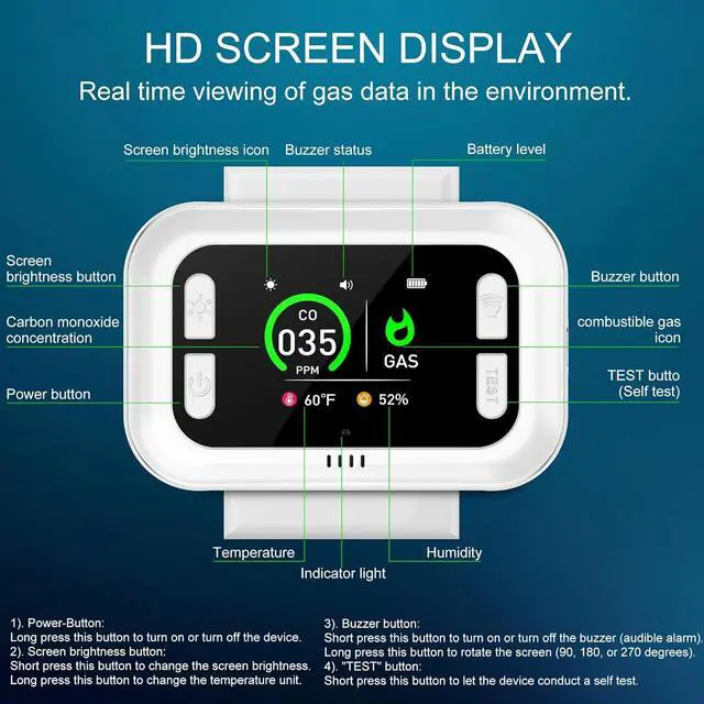 2.1 HD Screen All the data real time and dynamically show on the HD screen, we can read the data faster from the big icons like: CO ppm, Combustible gas warning icon, humidity, temperature, CO indicator icon, plug and alarm status.