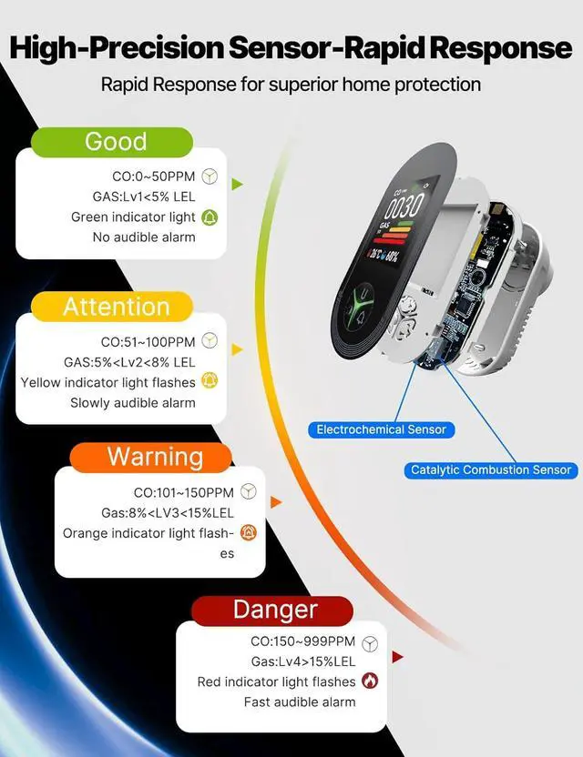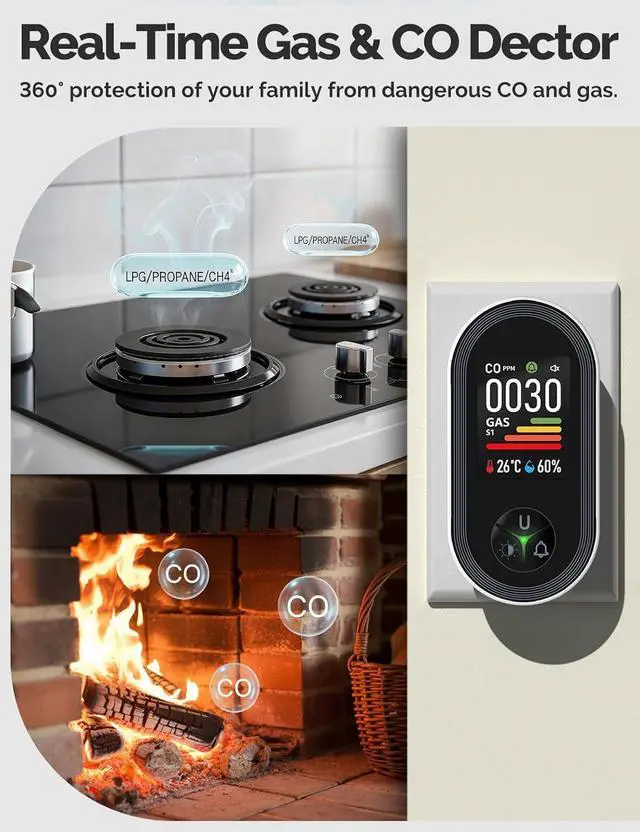 24/7 Dual Sensor Protection CO + Combustible Gas - Combines carbon monoxide and flammable gas (LPG/Natural Gas) sensors in one unit for full-time, reliable monitoring with fewer false alarms and no need for separate devices.