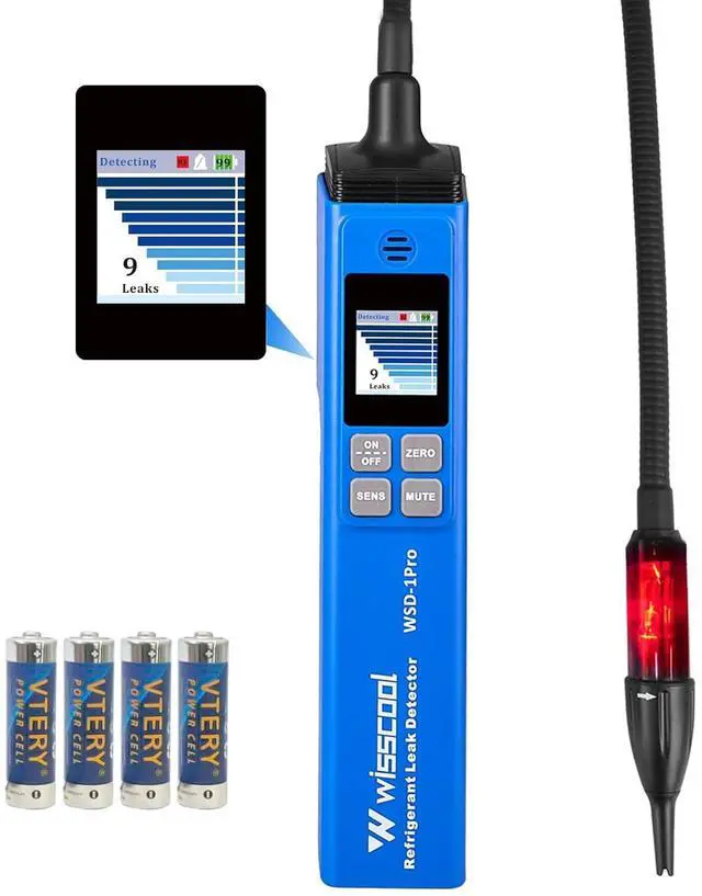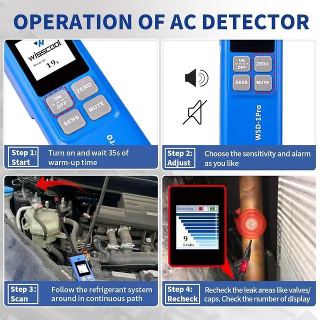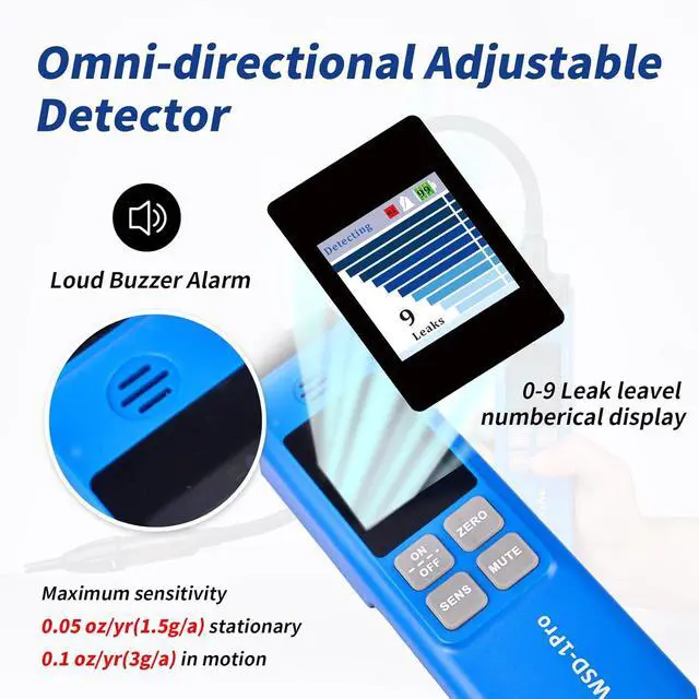 Alarm & Red Light]: Turning on the AC leak detector, it will emit a regular buzzing sound. Upon detecting a leak, the HVAC leak detector will make an urgent sound and the screen will display the leak level. Long press "MUTE" button turn on/off the buzzer. The flashing red light on the probe helps you find leaks even in narrow and dark places